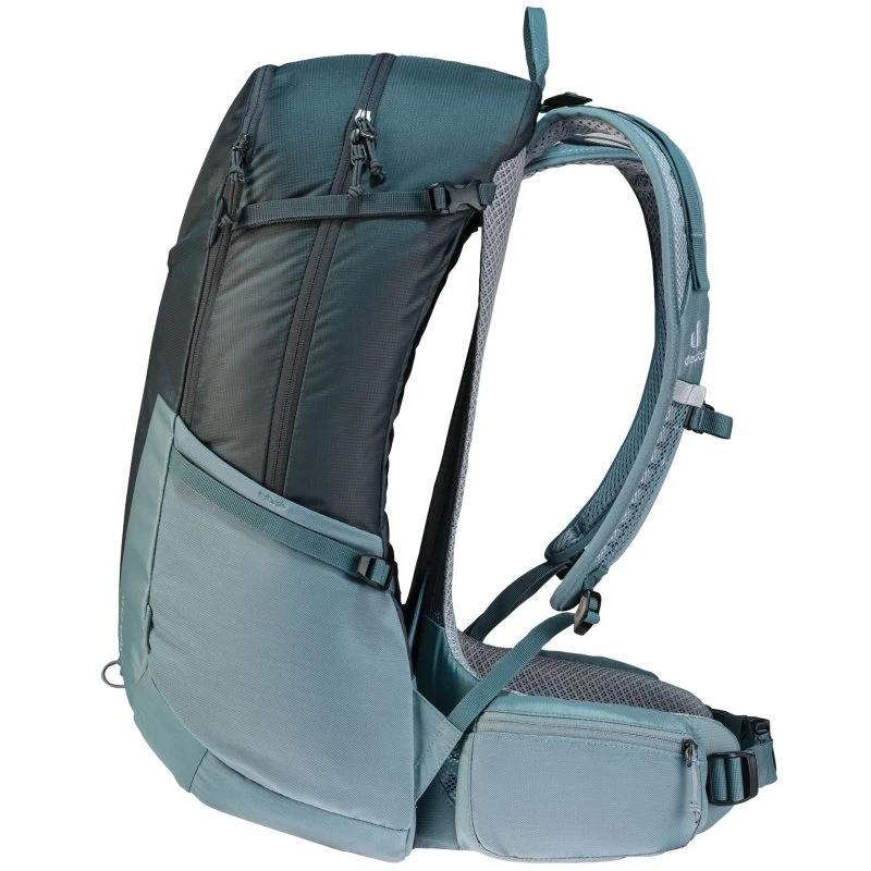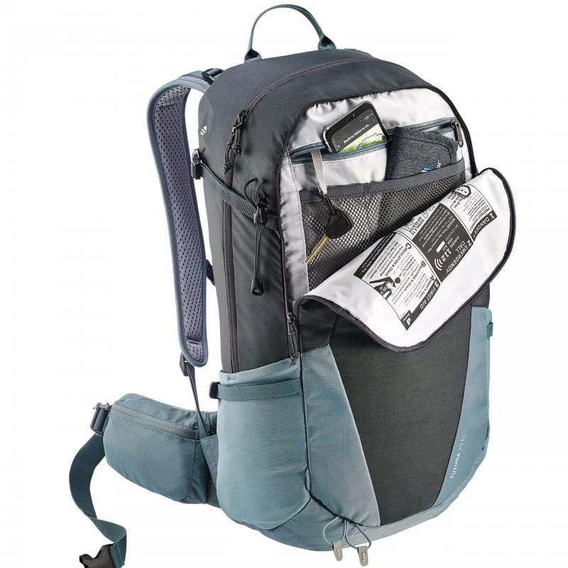 Der Deuter Futura 29 EL ist perfekt für alle Menschen geeignet, die größer sind als 1.85 m und nach einem bequemen sowie vielseitigen Rucksack suchen. Der Futura ist extrem vielseitig einsetzbar, er eignet sich zum Wandern, für eine kurze Mehrtagestour oder aber auch für die Uni und andere Alltagsabenteuer. Außerdem ist er sehr robust und strapazierfähig gearbeitet und hält vielerlei Belastungen stand. Im einzelnen besteht er aus 210D PA RECYCLED, dessen Garn zu 50% aus recycelten Rohstoffen hergestellt wird. Das zweite Hauptmaterial (600D PES) besteht aus einem Polyestergarn mit 600 Denier und ist mit einer dicken PU-Beschichtung ausgestattet, welche den Rucksack vor leichtem Regen schützt. Sollte es ausdauernd regnen so sorgt die integrierte Regenhülle für Abhilfe. Beide Materialien sind äußerst reißfest und sehr langlebig. Das bequem gestaltete Tragesystem ist extra lang und mit einem Netzrücken ausgestattet, dem Aircomfort Rückensystem. Es trägt sich super komfortabel und sorgt mit dem neuen Mesh für maximale Belüftung am Rücken, sodass Sie bis zu 25 % weniger schwitzen und damit nicht so schnell aus der Puste kommen. Die Seiten des Netzrückens sind leicht gepolstert und gehen nahtlos in die dicke Polsterung der Hüftflossen über. Dank der breiten und stabilen Form verteilen diese die Last vom Rücken auf die Hüften ideal. Die Polsterung der Schultergurte fällt etwas dezenter aus, dafür sind diese mit Belüftungsschlitzen ausgestattet. Der Futura 29 EL besitzt kein Deckelfach, sondern einen direkten Zugang zum Innenfach, welcher über einen großen U-förmigen Reißverschluss erfolgt. Mit 29 Liter Gesamtvolumen bekommt man hier auch einiges unter, wie Wechselkleidung, Proviant sowie wichtige Ausrüstung. Die Trekkingstöcke können außen befestigt werden, auch Schlaufen für eine Helmhalterung (Helmhalterung als Zubehör verfügbar) sind hier zu finden. Trinkflaschen oder andere Kleinteile finden in den Außenfächern und Hüftflossentaschen Platz. Eine Vorbereitung für ein Trinksystem ist integriert. Im Frontfach befindet sich zudem ein Organizer, was den Futura 29 EL zu einem absoluten Allrounder macht. Hinweis: Der Rucksack wird ohne Inhalt geliefert, die Bilder dienen nur zur Veranschaulichung.