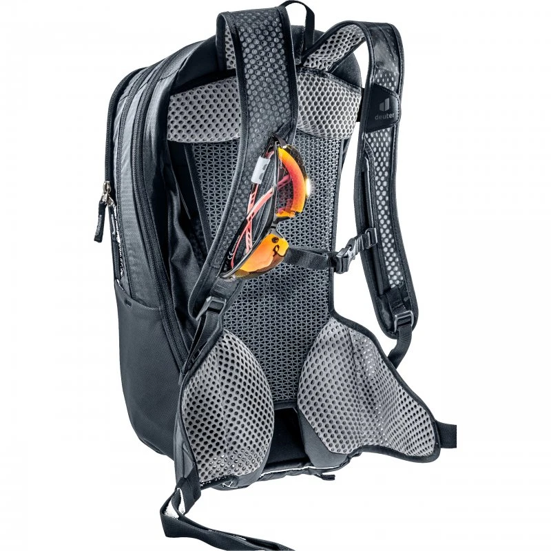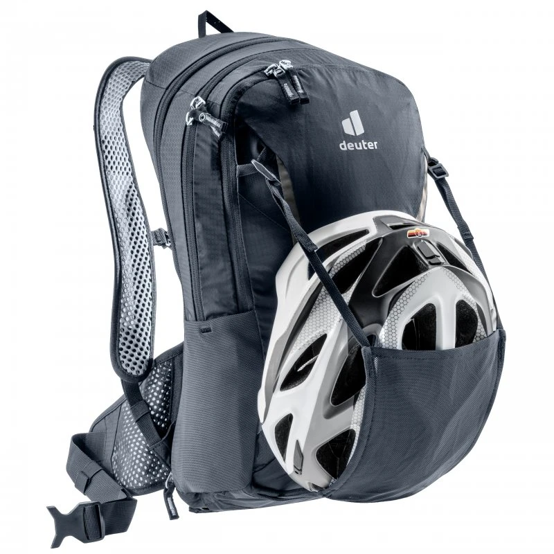 Als federleichter Begleiter auf Ihrer Bike-Tagestour ist der Race EXP Air von Deuter perfekt. Gerade einmal 800 Gramm bringt dieses Leichtgewicht auf die Waage. Aber auch im Alltag bietet der Race EXP Air ausreichend Platz für die wichtigsten Dinge, wenn Sie auf dem Weg zur Arbeit sind oder ein paar Dinge in der Stadt erledigen möchten. Der Rucksack ist sehr robust und strapazierfähig und bietet ein Volumen von 14 + 3 Litern. Das große Hauptfach ist mit einem zusätzlichen Stretch-Innenfach zum Verstauen nasser Kleidung oder der Trinkblase ausgestattet. Zwei Seitenfächer bieten Platz für kleine Trinkflaschen. Das geräumige vordere Fach bietet kleinere Fächer in denen Sie Geldbörse, Handy, Schlüssel oder Kleinigkeiten sortiert unterbringen können. Das Airstripes Netzrückensystem bietet eine Hinterlüftung, welche viel Tragekomfort bietet. Die Schultergurte sind ebenfalls atmungsaktiv gefüttert und können in der Länge eingestellt werden. Ein verstaubares Flap mit Helmhalterung, eine Rücklichtschlaufe und eine Brillenhalterung am Schultergurt runden das Ganze ab. Natürlich ist auch die Deuter Regenhülle dabei.