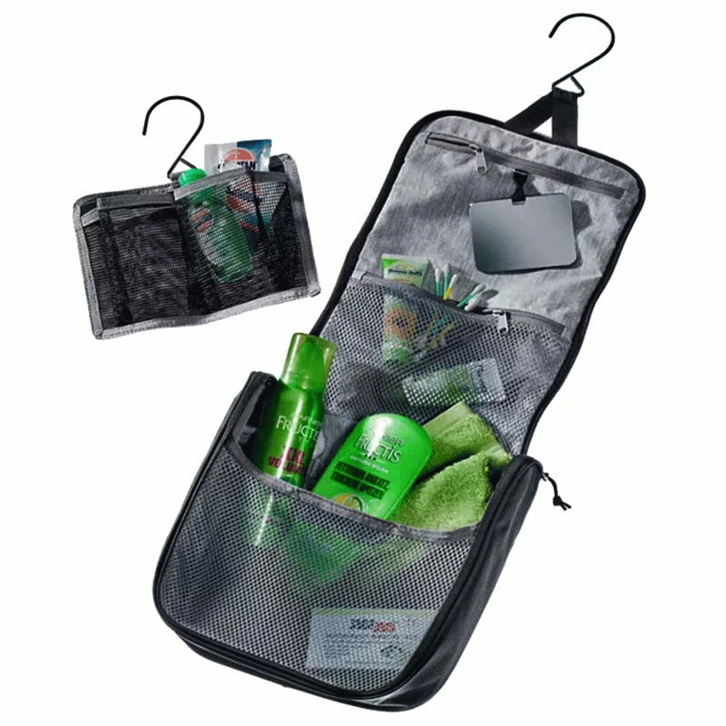 Der Deuter Wash Center II ist ein großzügiger Kulturbeutel und bietet ausreichend Platz, um darin Zahnbürste, Rasierer, Bürste und sonstige Dinge des persönlichen Bedarfs unterzubringen. Viele verschiedene Fächer, teils mit Reißverschluss und Schlaufen helfen Ordnung zu halten. Ein großer Haken ermöglicht das Aufhängen des Deuter Wash Centers, wenn nicht genügend Ablagemöglichkeiten vorhanden sind. Außerdem ist der Kulturbeutel mit einem herausnehmbaren Innenteil für die Dusche ausgestattet. Ein integrierter, abnehmbarer Spiegel hilft beim rasieren ungemein. Auch für die Frauen beim Zupfen der Augenbrauen ist dieser sehr nützlich. Hinweis: Der Kulturbeutel wird ohne Inhalt geliefert, die Abbildung dient lediglich als Beispiel.