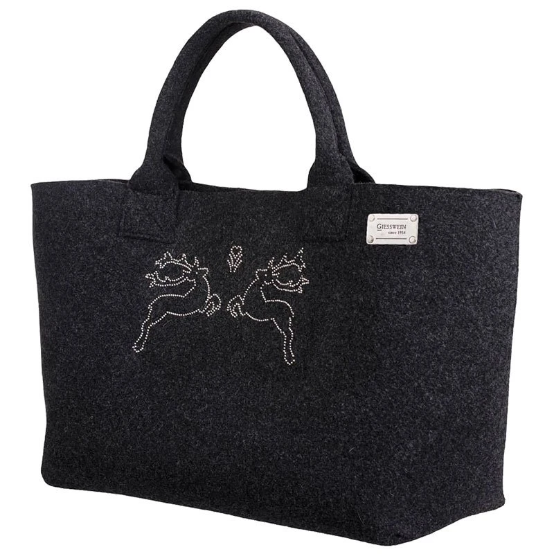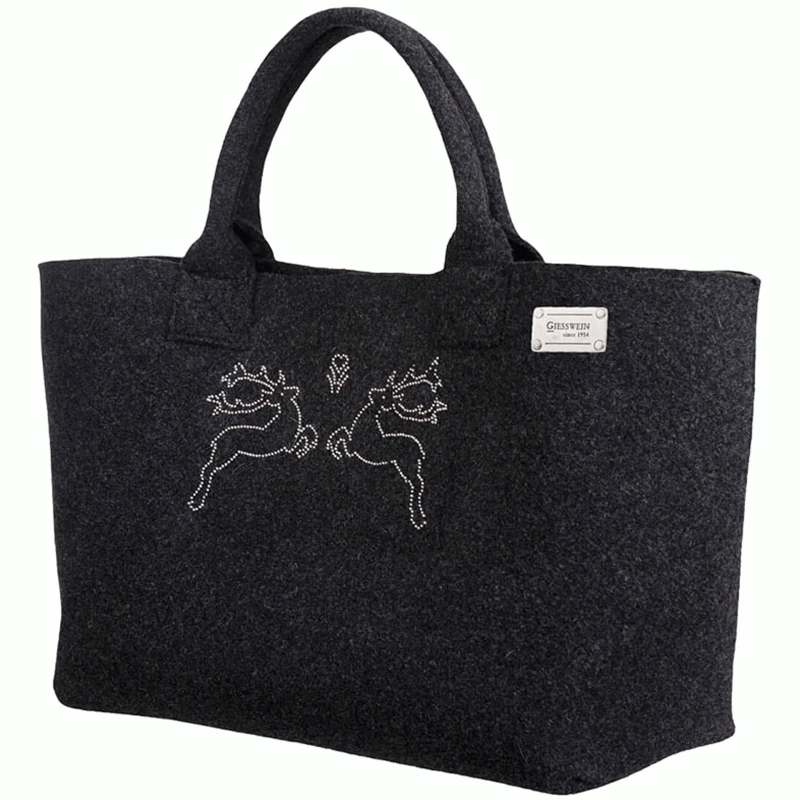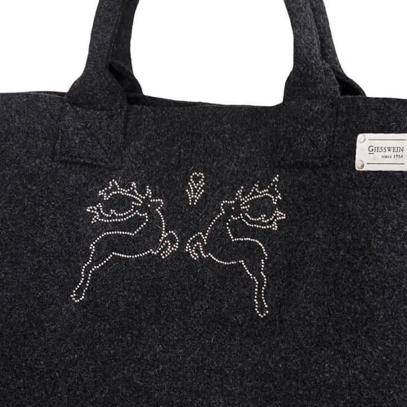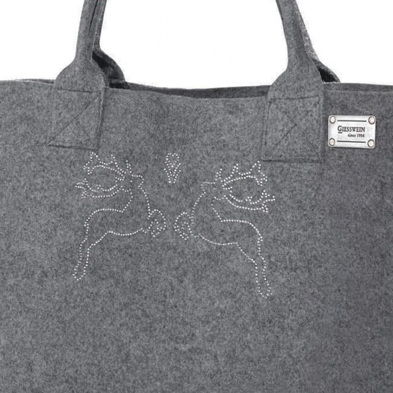 Die große Tasche namens Lydia besteht aus dicker, gewalkter Merinowolle und ist sehr hochwertig. Ein geringer Anteil an Polyester macht sie noch robuster. Ihr zeitloses Design passt zu jedem Outfit und zu jeder Gelegenheit. Lediglich ein Hirsch-Piktogramm aus Glitzersteinen ziert die Tasche. Egal ob beim Einkauf oder Saunabesuch, die Tasche bietet einfach jede Menge Platz.