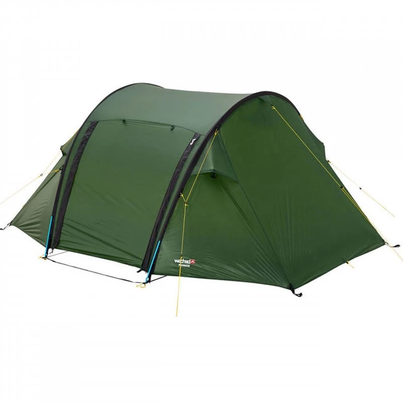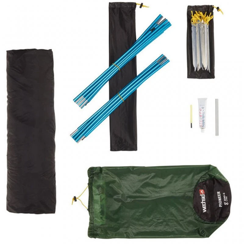 Das Pioneer gehört der Zero-G Line an und steht für Leichtigkeit und hohe Qualtät. Dank des geringen Gewichts und des kleinen Packmaßes eignet es sich perfekt für Trekking- und Radtouren, denn es wiegt gerade einmal 2.100 g. Durch die kompakte Machart ist es extrem windstabil. Farblich markierte Gestänge-Endtips und Gestängekanaleingänge ermöglichen einen sehr schnellen und unkomplizierten Aufbau. Zudem kann bei diesem Model das Innenzelt am Außenzelt eingehängt bleiben, wodurch auch der kombinierte Aufbau im Handumdrehen möglich ist. Das ultraleichte Außenzeltmaterial bestehend aus extrem reißfestem Ripstop Nylon 20D ist mit Silikon beschichtet und erreicht dadurch eine Wasserdichtigkeit von 3.000 mm WS. Der feste Zeltboden aus Ripstop Nylon 30D ist mit PU beschichtet und erreicht 5.000 mm WS. Für eine höhere Langlebigkeit Ihres Zeltes empfiehlt es sich das passenden Groundsheet (nicht im Lieferumfang enthalten!) als zusätzlichen Schutz zu verwenden. Das leichte Innenzeltmaterial besteht aus Ripstop Nylon 20D, ist wasserabweisend und hoch atmungsaktiv, sodass es ein angenehmes Schlafklima bietet, vier verschließbare Ventilationsklappen sorgen für zusätzliche Belüftungsmöglichkeiten. Vom Aufbau her ist dieses Zelt ein Tunnelzelt mit Längsschläferplätzen und bietet ausreichend Platz für 2 Personen. Es ist mit zwei gleichwertigen Eingängen ausgestattet, welche eine hervorragende Durchlüftung und einen leichten Ein- sowie Ausstieg für beide Personen ermöglichen. Die geöffneten Türen lassen sich zudem mit zusätzlichen Aufstellstangen (nicht im Lieferumfang enthalten!) zum Vordach umfunktionieren. Weitere Besonderheiten der Zero-G Serie sind beispielsweise der erhöhte UV-Schutz des Zeltmaterials, eine sehr hoher Weiterreißfestigkeit des Außenzeltmaterial (von 7 KG) und das leichte und anodisierte Aluminium Gestänge sowie Aluminium V-Heringe und viele durchdachte Details mehr.